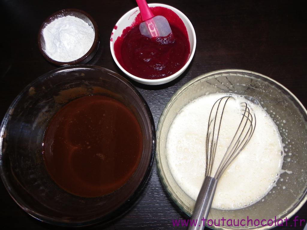 - J'ai ajouté en dernier le chocolat-beurre fondu dans la préparation à la betterave rouge. Et j'ai bien mélangé au fouet. On perd la couleur rouge mais le mélange chocolaté prend une coloration légèrement rosé. J'ai réservé.